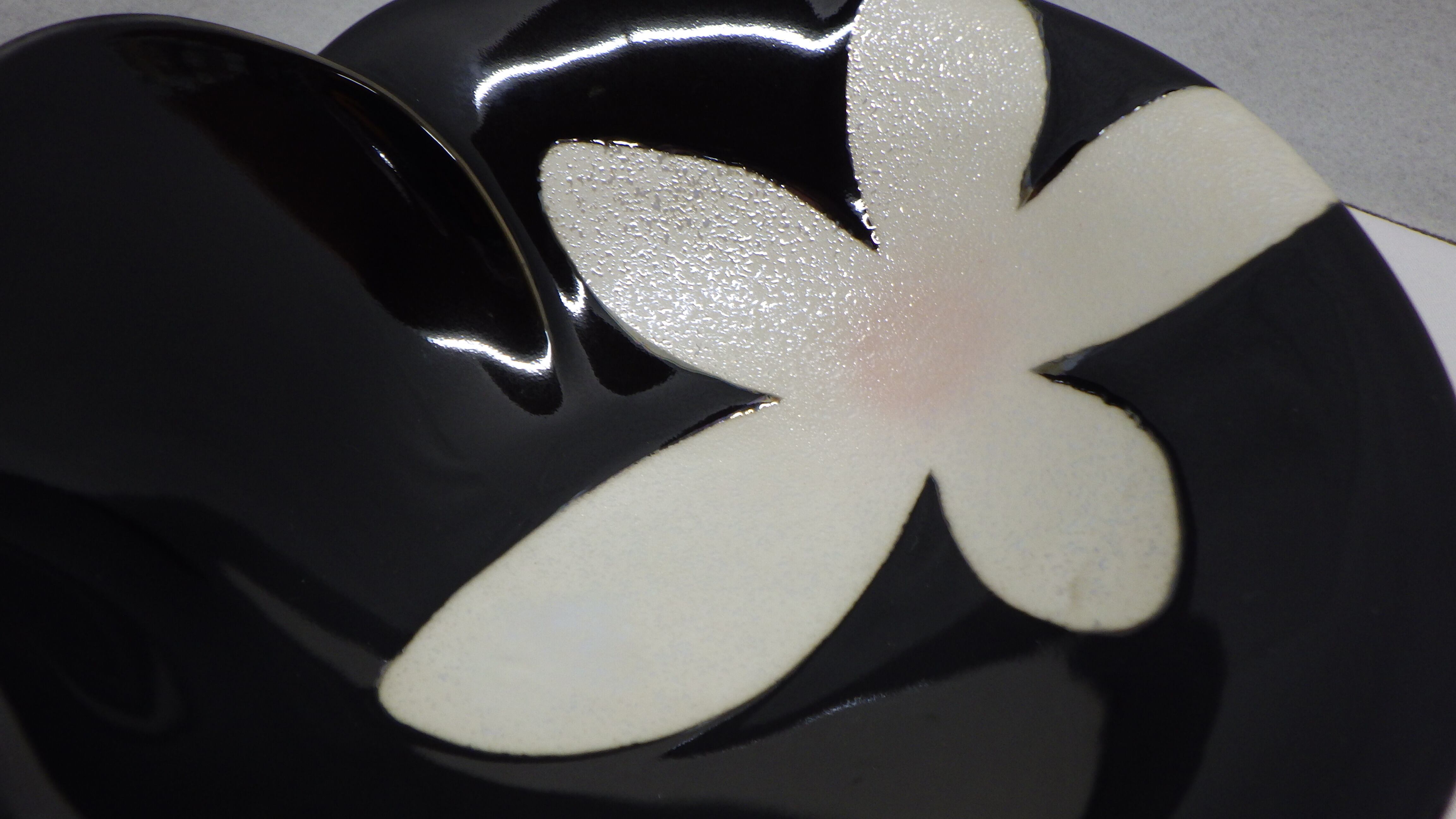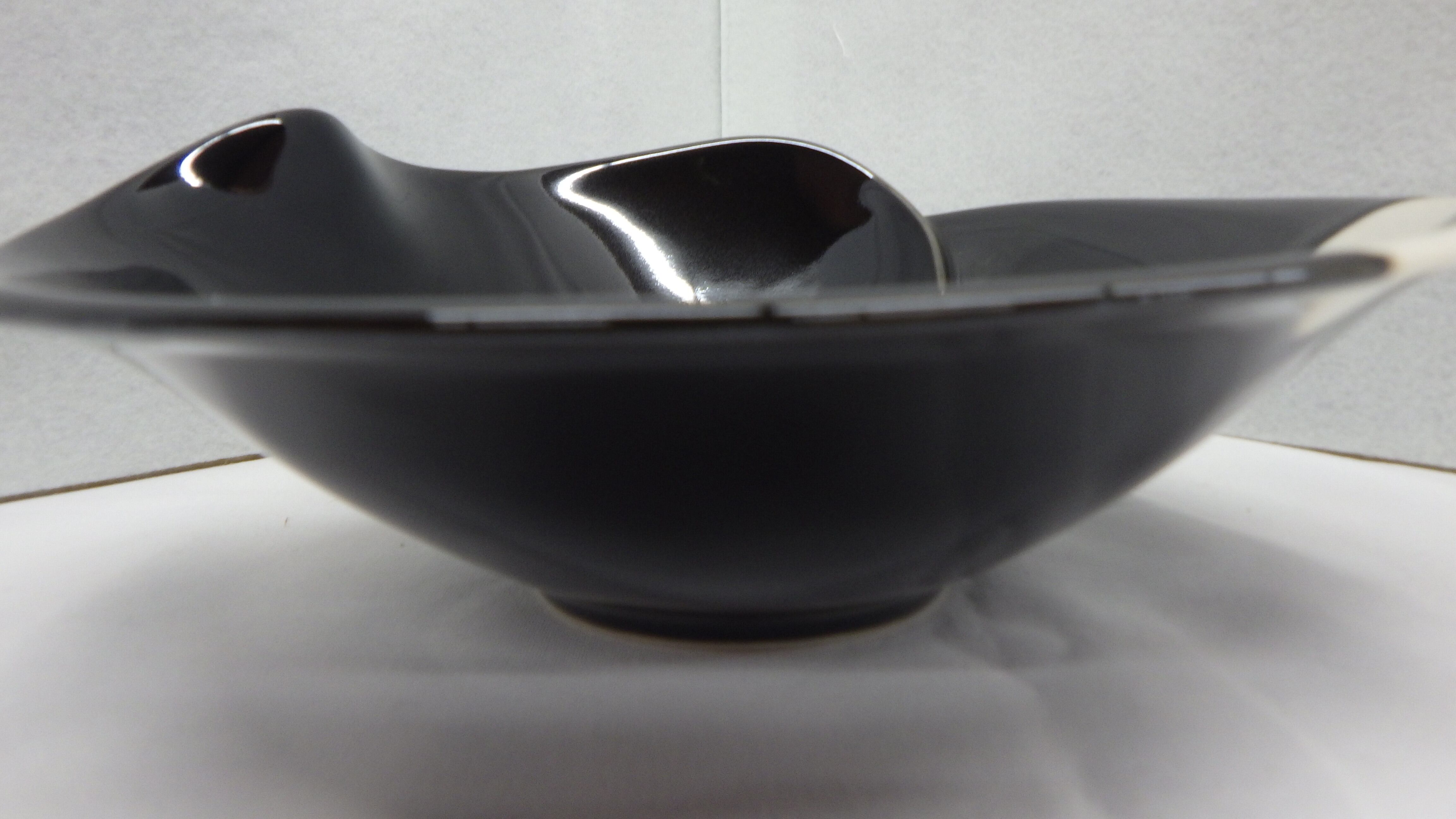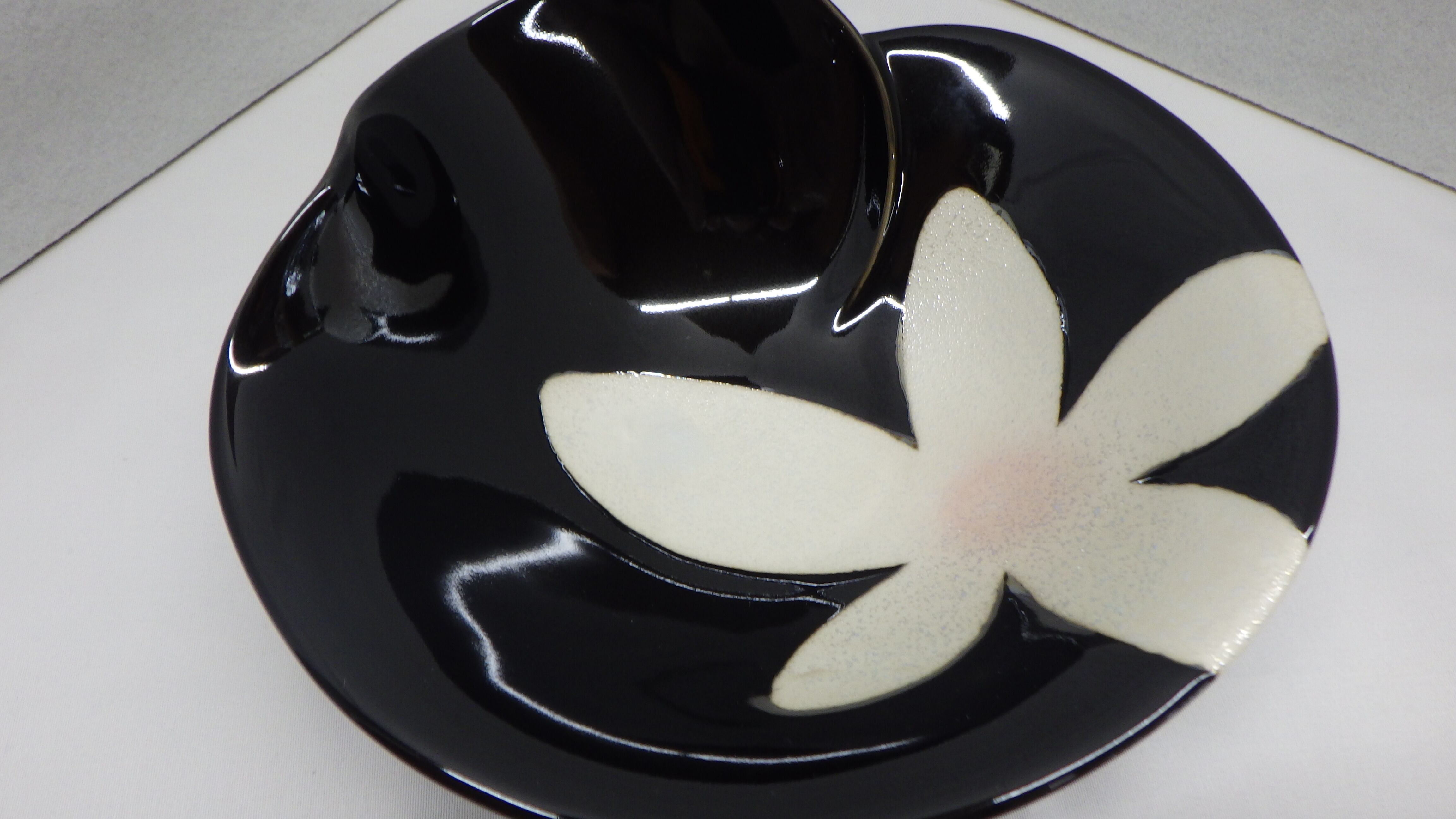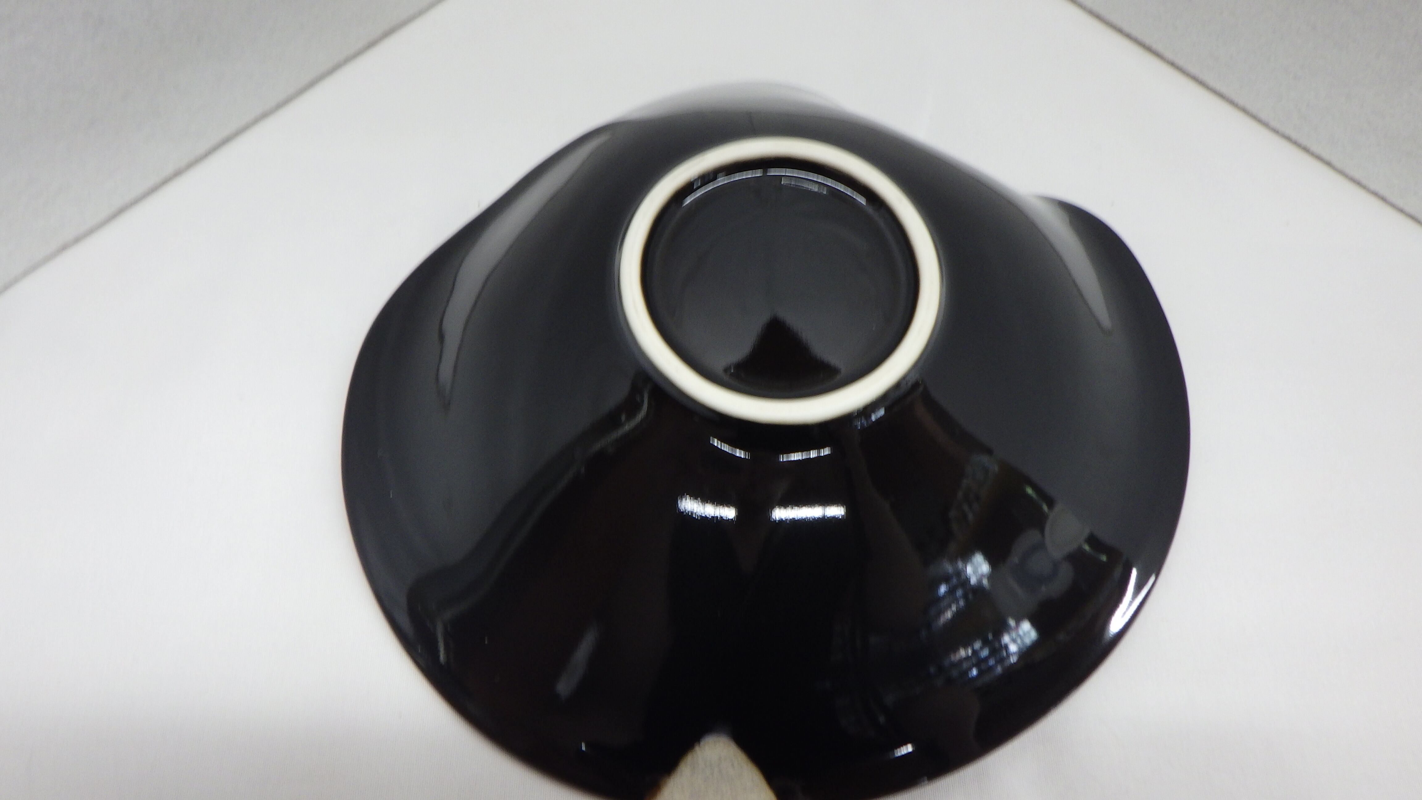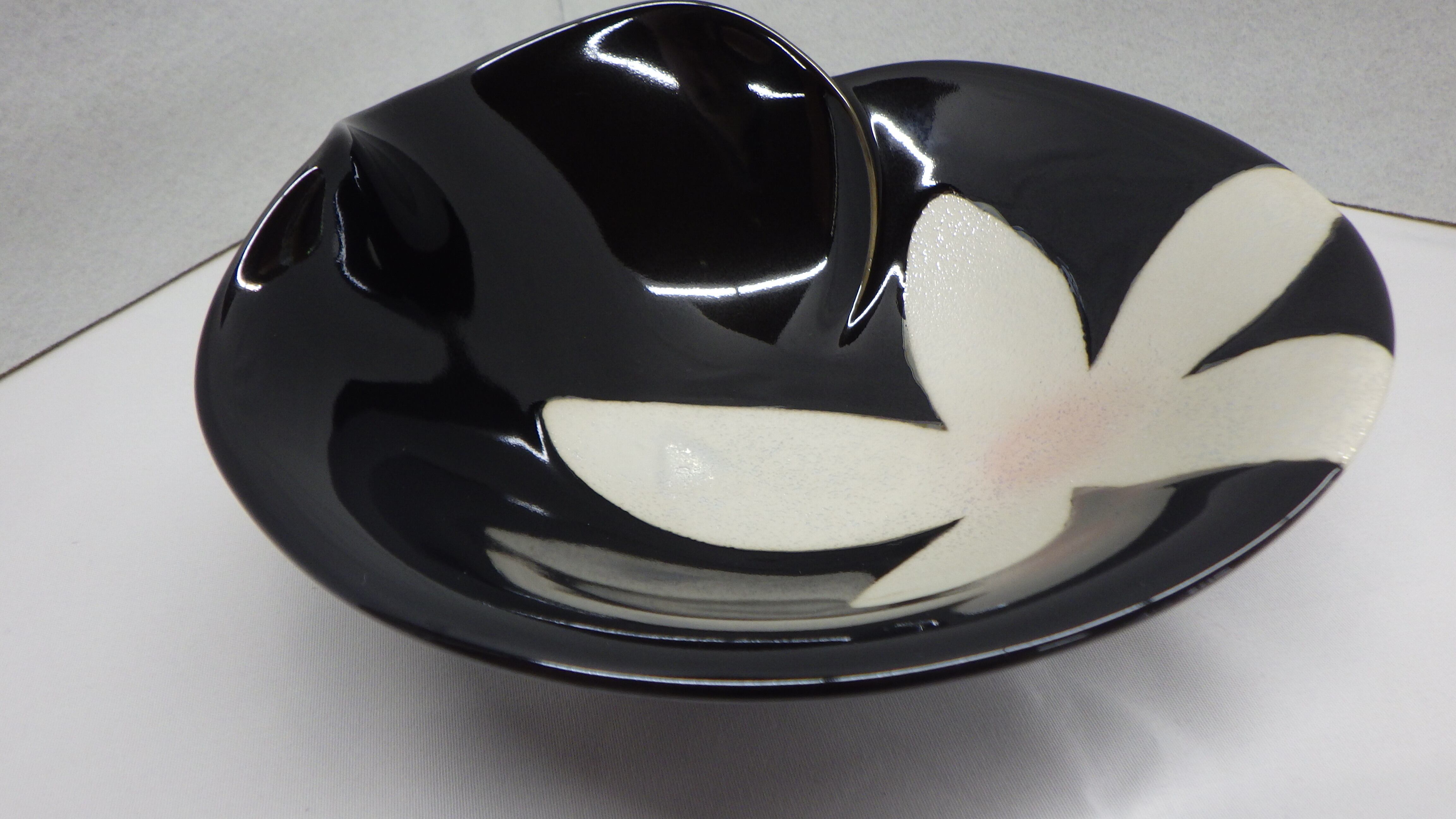 ・黒色の器に巻花が描かれています。